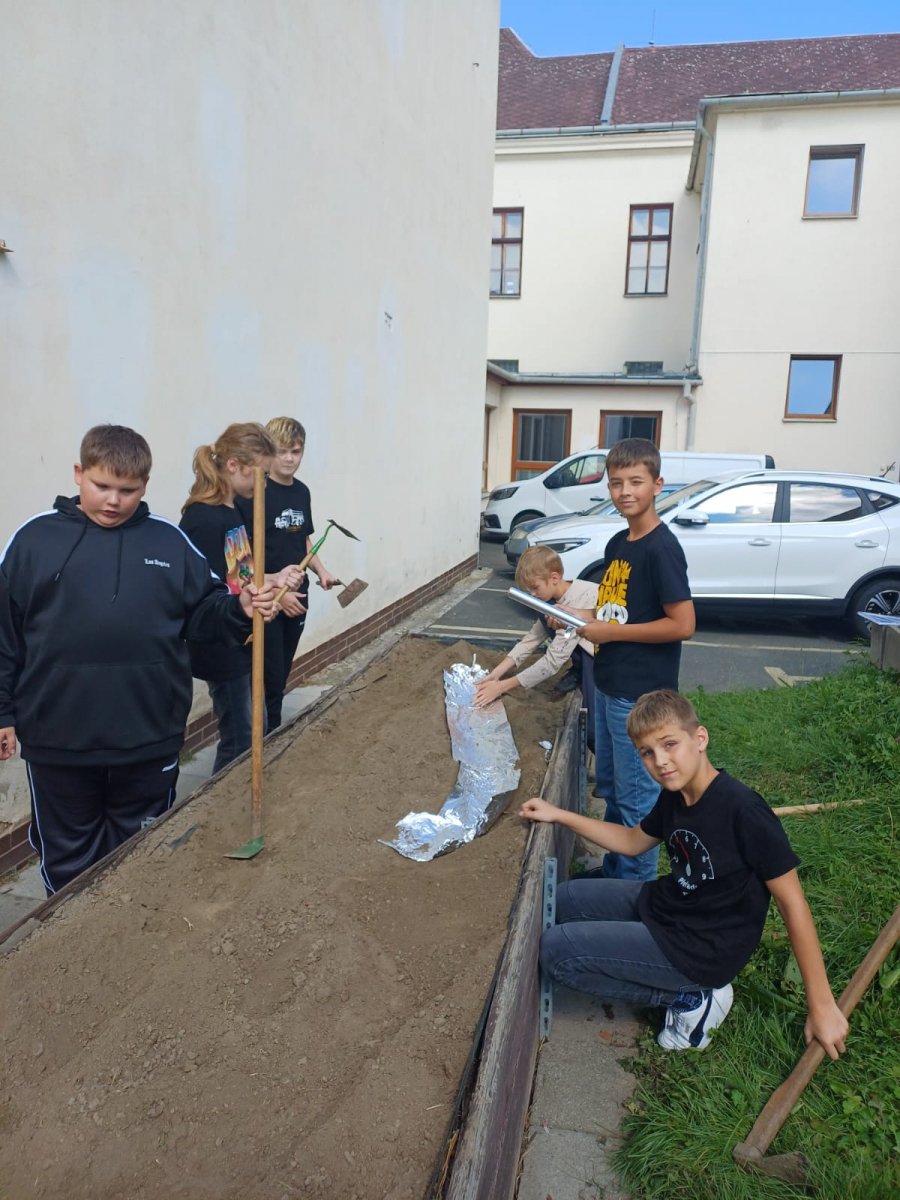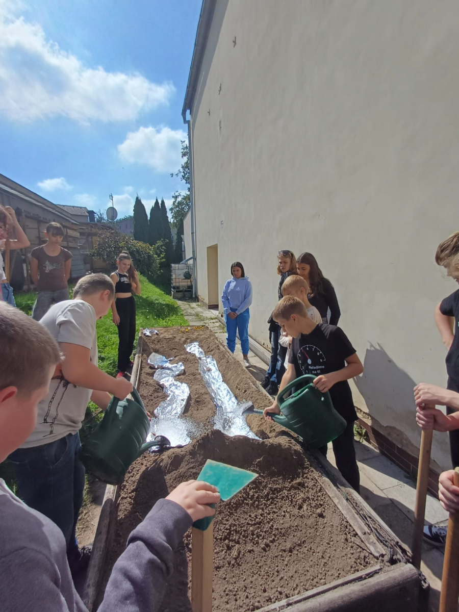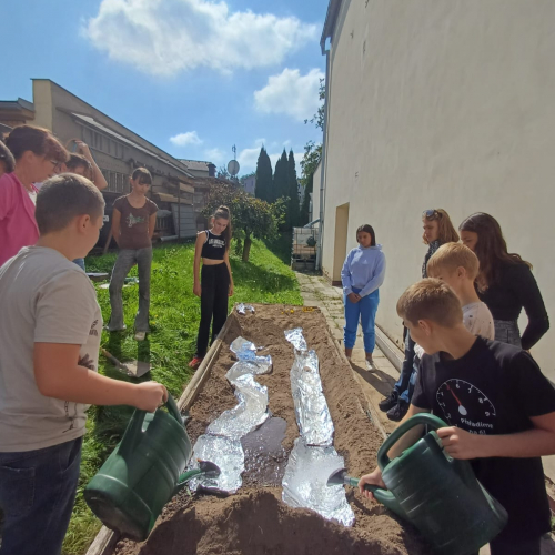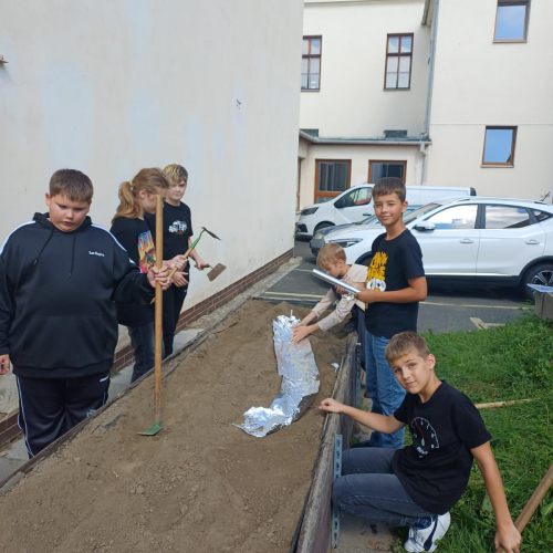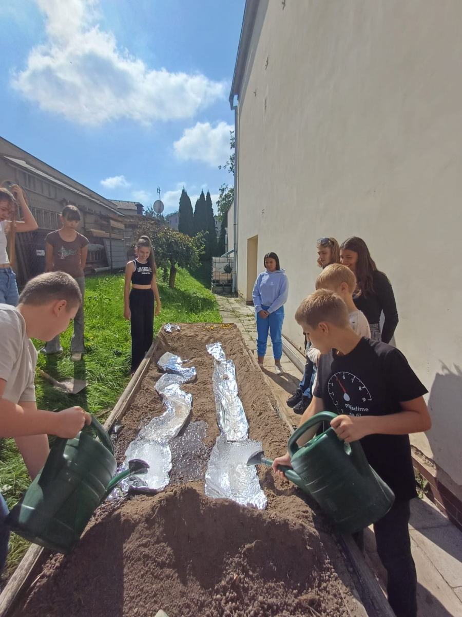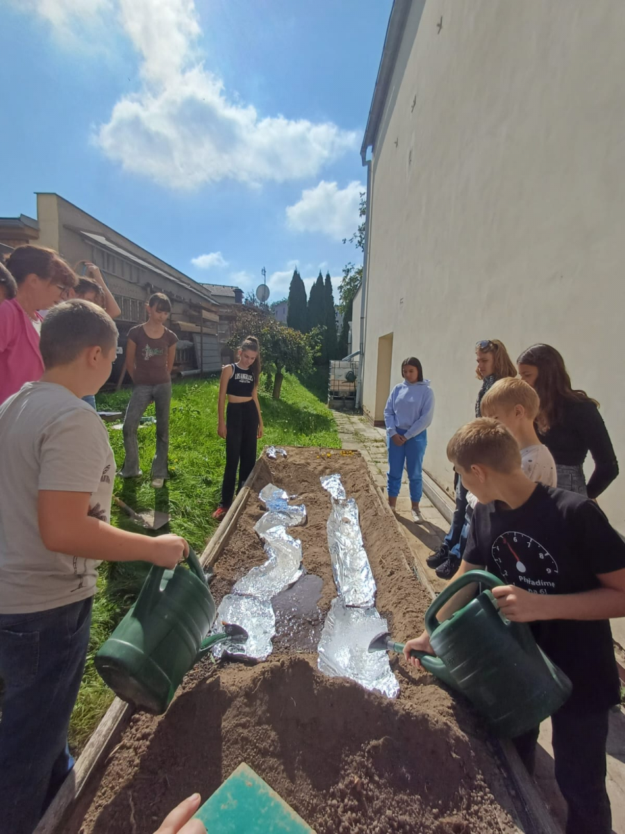 Žáci využili vyvýšené záhony na školní zahradě k vytvoření modelu dvou rozdílných vodních toků.