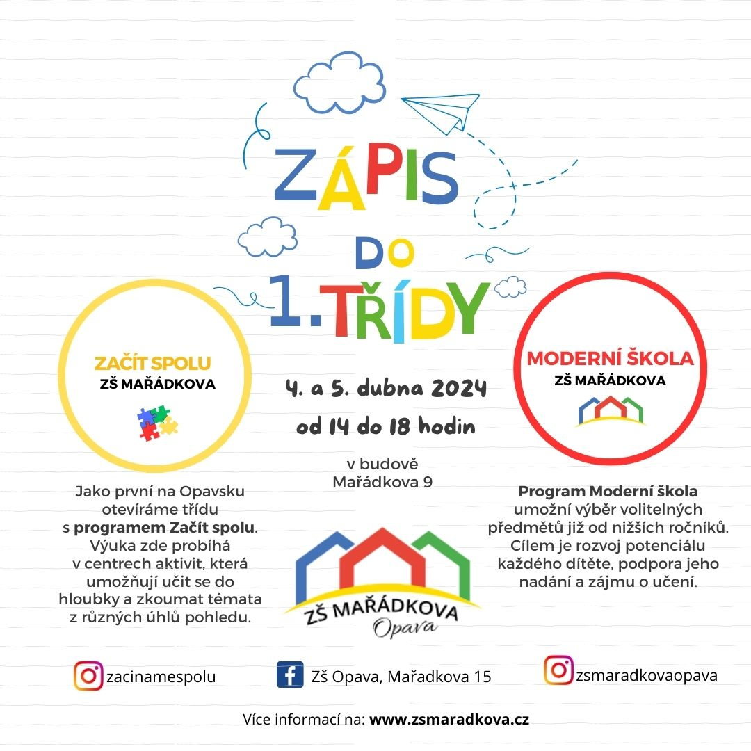 Zápis předškoláků na naši školu se uskuteční ve dnech 4. 4. a 5. 4. 2024 od 14 do 18 hodiny v budově Mařádkova 9 (i pro odloučené pracoviště Krnovská 101).