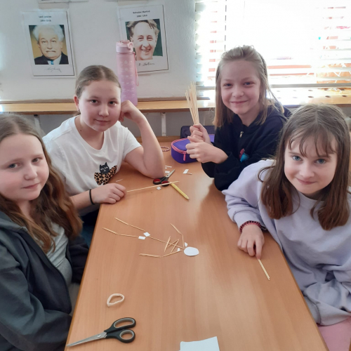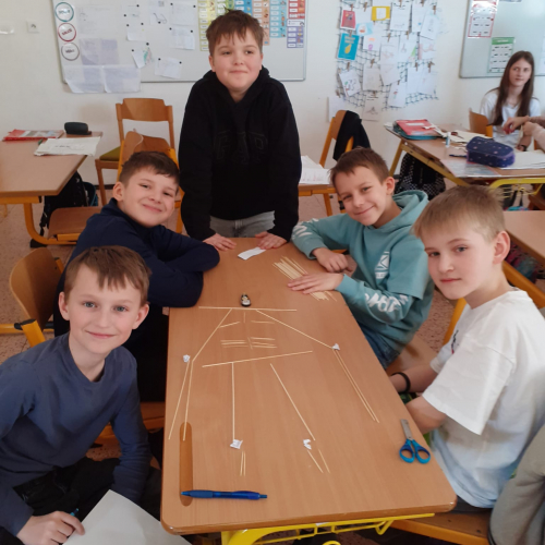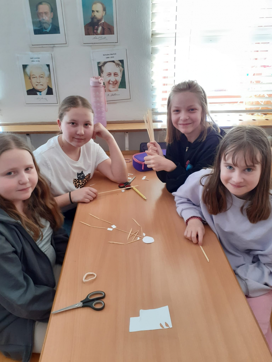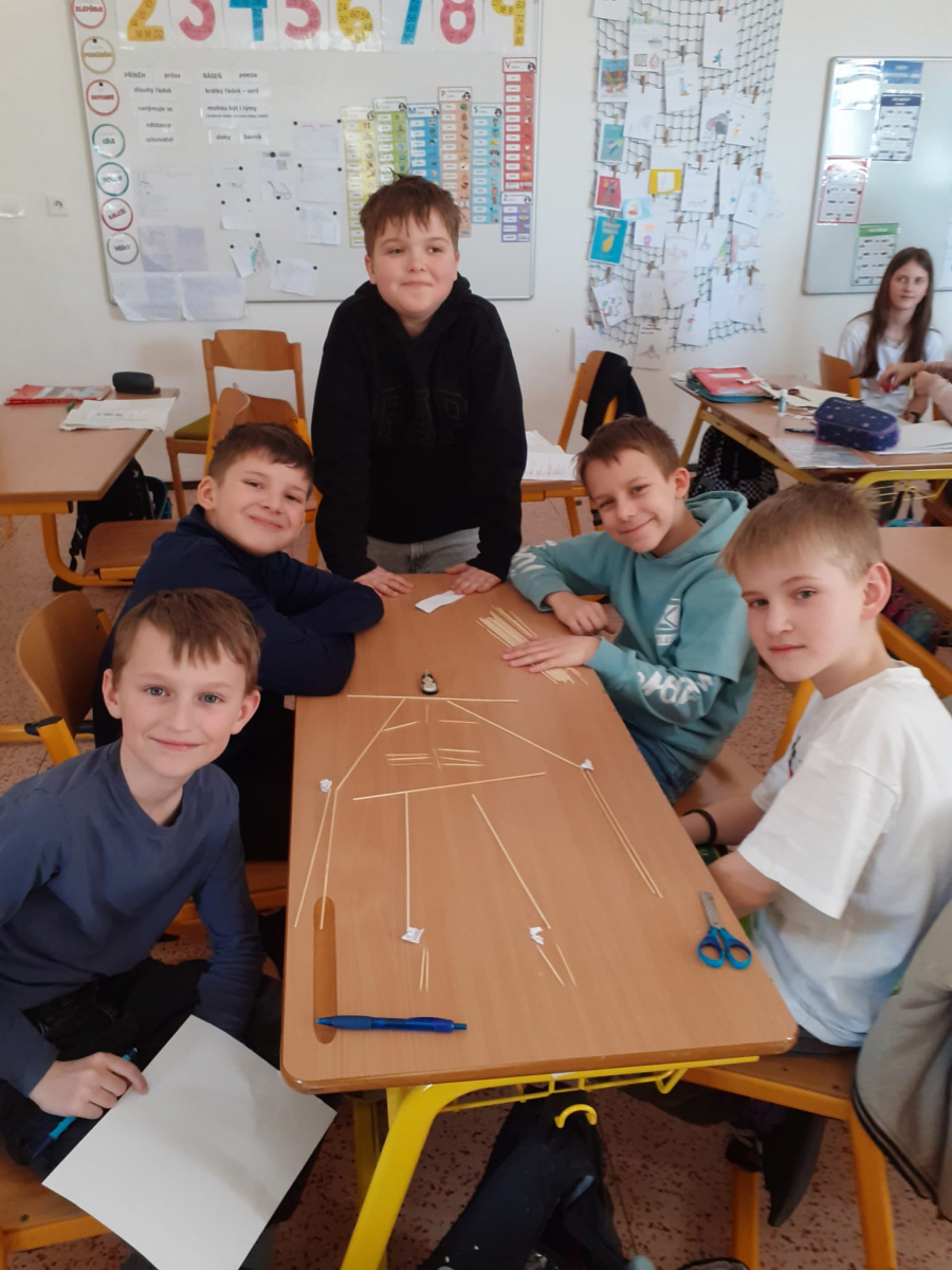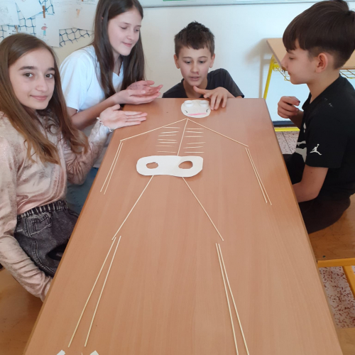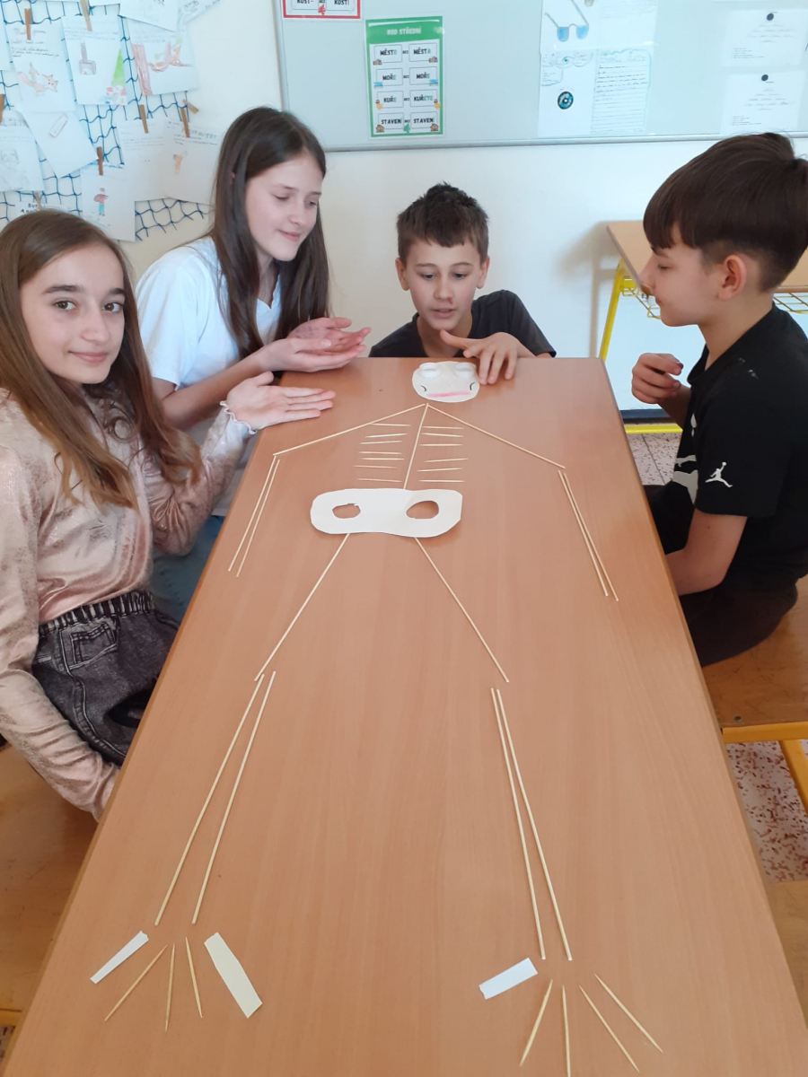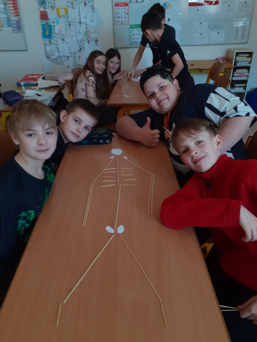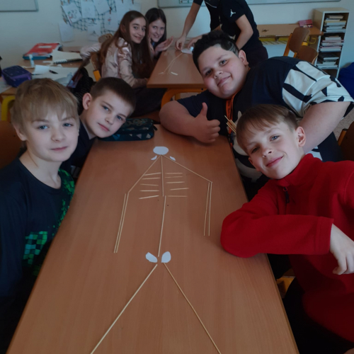 V hodinách předmětu ČAS si žáci 5.B vyzkoušeli, jak sestavit co nejpřesnější model kostry člověka a popsat názvy kostí. Použili k tomu obyčejné špejle a docela se jim to povedlo.