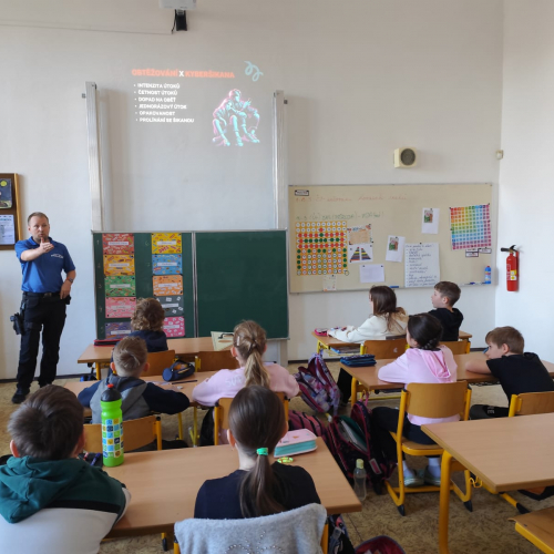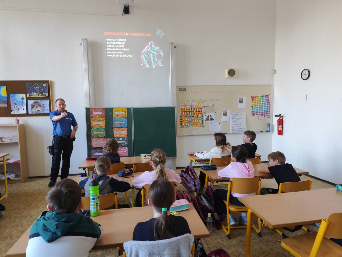 Internet je skvělý sluha, ale může být i nebezpečný pán. Proto se v pondělí 9. března v naší škole uskutečnil preventivní program s názvem „Nebezpečí v kyberprostoru“, kterého se zúčastnili žáci třídy 4. C. Pozvání přijal pan Adam Klimeš, preventista Městské policie, který s dětmi otevřeně mluvil o nástrahách, které na ně mohou v digitálním světě čekat. A co jsme se dozvěděli? Jak se slušně chovat na sociálních sítích a v herních chatech, jak rozpoznat kyberšikanu, jak se jí bránit, na koho se obrátit o pomoc.
