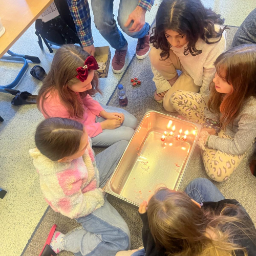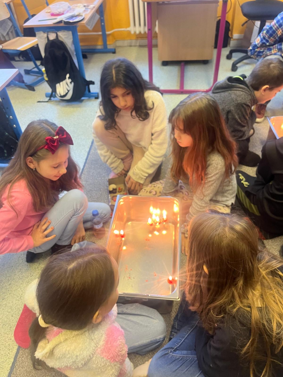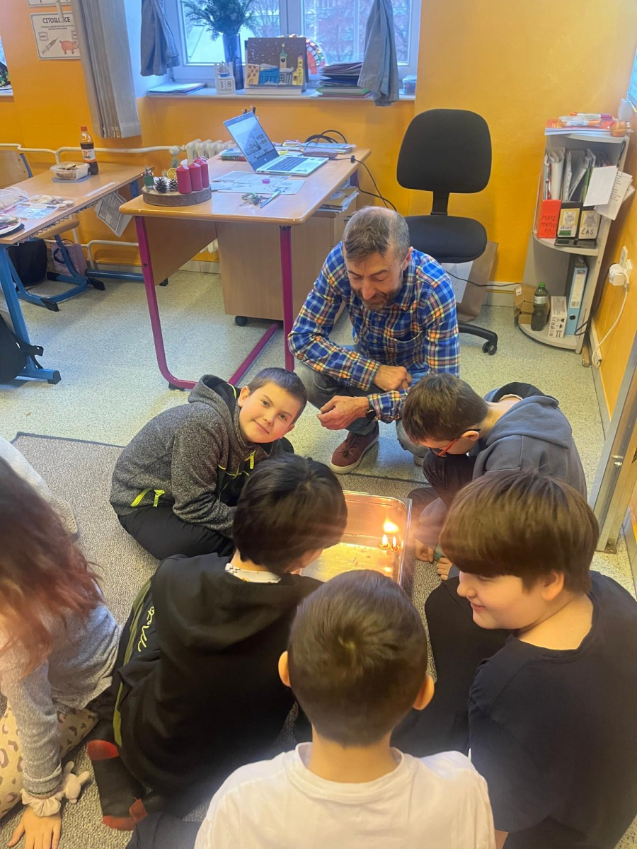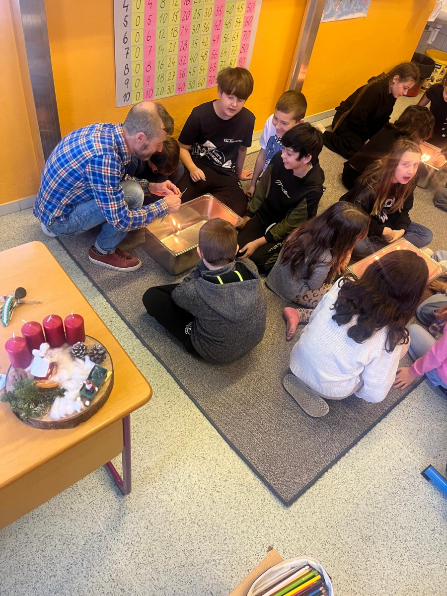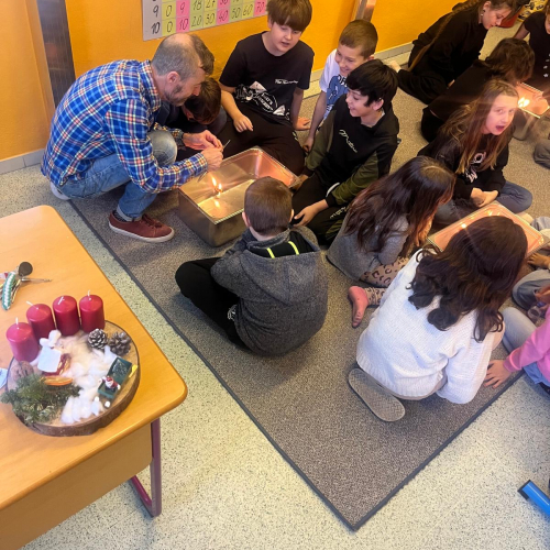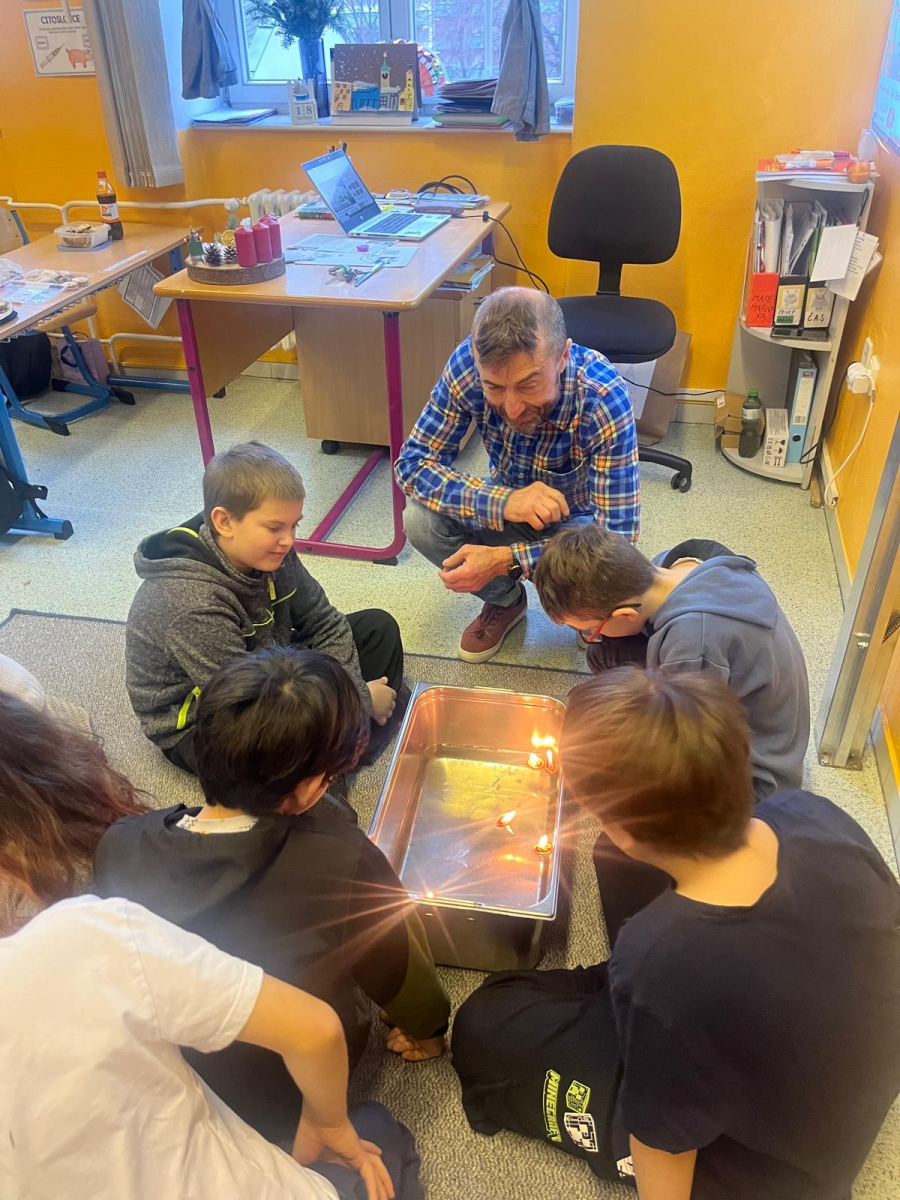 Poslední školní kalendářní den skýtá pro malé školáky možnost vyzkoušet si na „nečisto“ některé lidové zvyky, obyčeje a tradice. I my ze 4.A jsme se rozhodli, že se pustíme do některého z nich. Lití olova a následné věštění nám připadalo hodně nebezpečné a jen pro jednoho účastníka a méně pro ostatní pozorovatele, vhodnější se zdály dnes už pozapomenuté skořápky a svíčka plující po vodní hladině. Počáteční nezdar učitele s výrobou bárek byl zažehnán tak, že stěžeň korábu se zkrátil na polovinu a předešlo se převrácení člunu na tzv. Titánský. Na druhý pokus se už postupně zapálit všechny uzly a opatrně plavidla vysunout na vodu předem připravených nádob. Hurá! Čekal jsem mnohé, ale reakce dětí mě opravdu překvapila. Děcka s radostí a spoustou komentářů glosovala svoji pouť a vznikaly sázky, která že lodička se spojí, kdo zůstane u břehu, která zhasne první a třeba kdo vytvoří s kým dvojici a jiné formace. Skvělá zábava a děti nepotřebovaly do ruky ani mobilní telefon. A protože jsme si přečetli na začátku produkce legend a vysvětlování, každý věděl, co ho příští rok čeká, kam poputuje a co ho nemine. V jednu chvíli se mi dokonce zdálo, že školáčci pozapomněli na dárky a pokud by svíčka hořela doteď, tak tam snad sedí ještě teď...Ale tak má skončit správná pohádka a nakonec dopadla tím nejlepším způsobem, jak měla… Pod stromečkem si všichni rozbalili dáreček ze svého kamaráda a mohli jsme pak najít večer spokojeně odejít slavit nastávající vánoční svátky a společně s rodinnými svátky znovu přijít. štěstí.